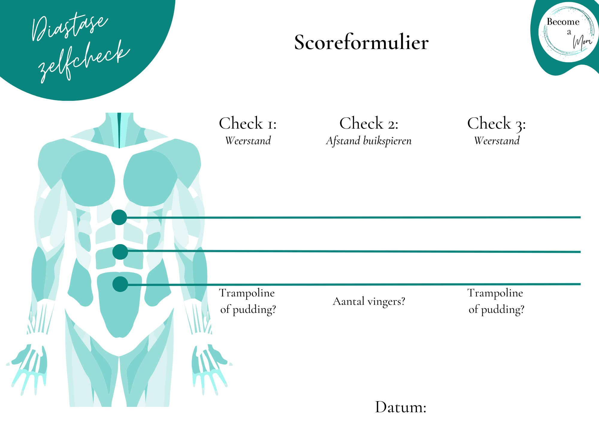 Doe deze diastase zelfcheck elke 2-3 weken (vanaf 4 wk na de bevalling) om de voortgang bij jezelf in de gaten te houden.
